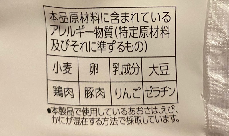 - アレルゲン:小麦、卵、乳成分、大豆、鶏肉、豚肉、りんご、ゼラチン