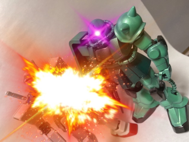 これは鬼滅の刃の竈門炭次郎君ですが、ガンプラでもこのようにエフェクトを使って写真を撮れます。