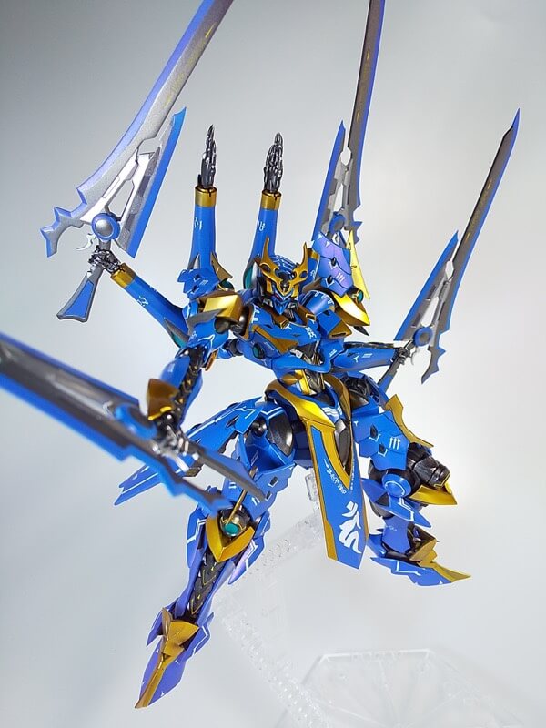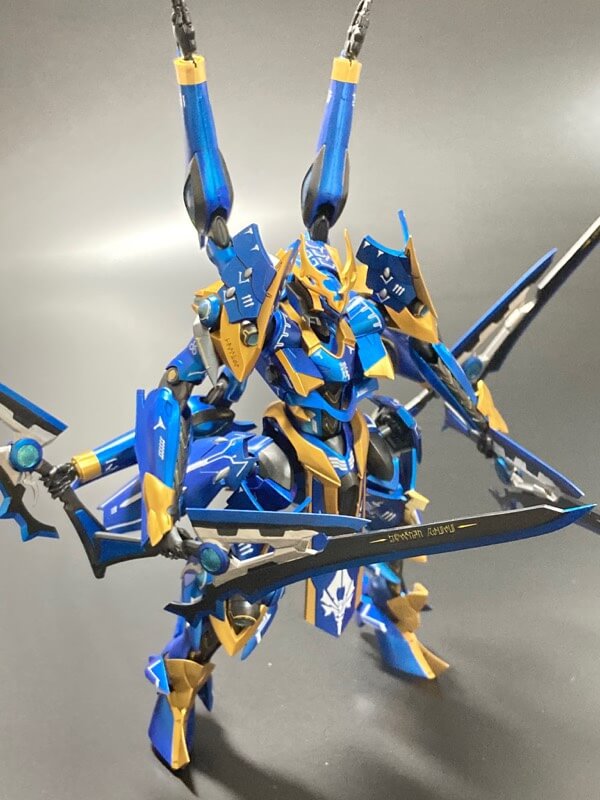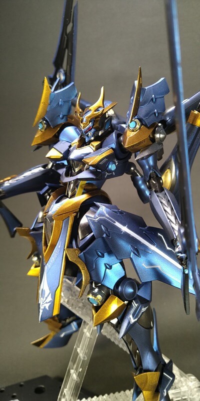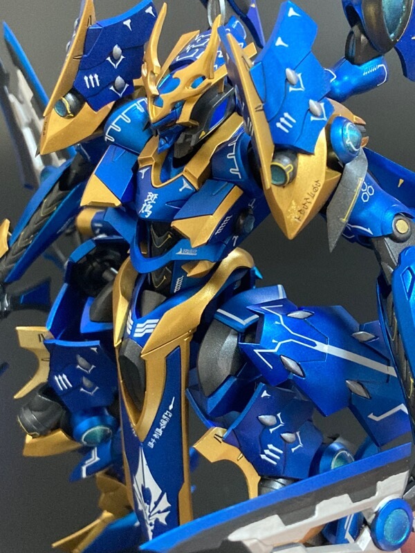 イカルガで参加します。破損した前垂れデカールを梵字(不動明王)に置換してます。うみんちゅビスマスベースの金と、アメジストパープルコートの青等、メタリック&パールの半艶仕上げです。 pic.twitter.com/SO8YMk4rL2