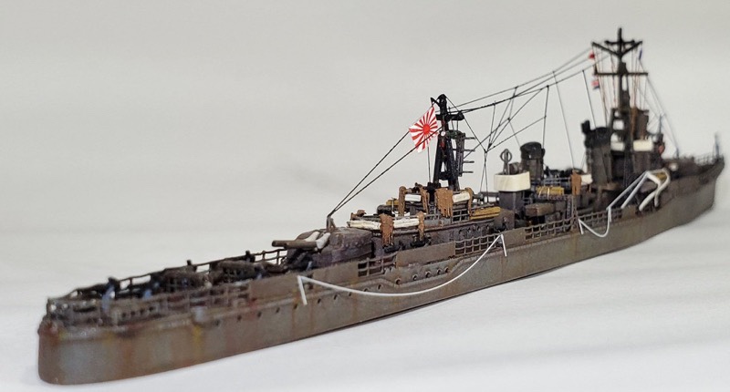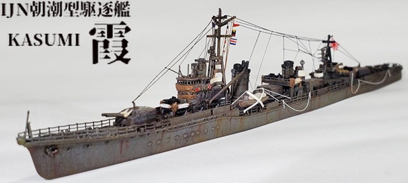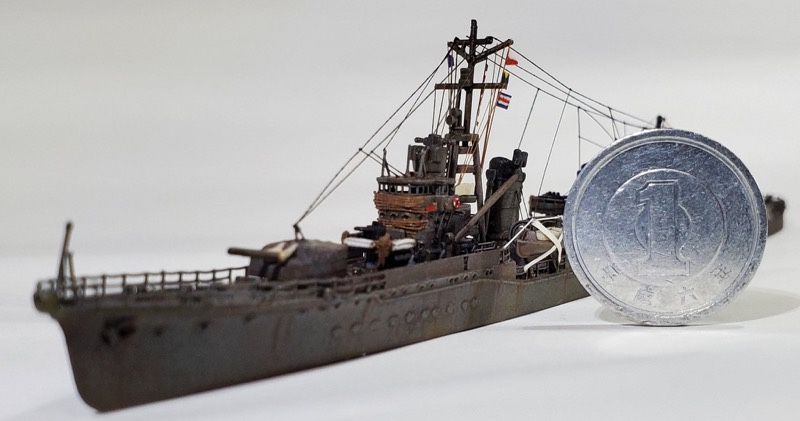 今回も艦船模型で参加です。ハセガワ1/700朝潮型駆逐艦霞です。駆逐艦という小さなキットにエッチングパーツの他、空中線、防弾ロープ、軍艦旗を自作し塗装を複雑にする事で情報量をギュッと詰めてみました pic.twitter.com/IyCq3GTT91