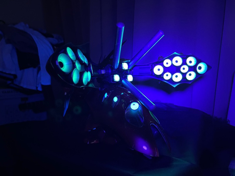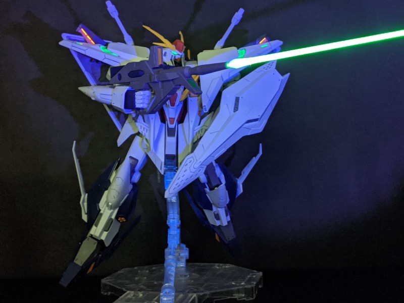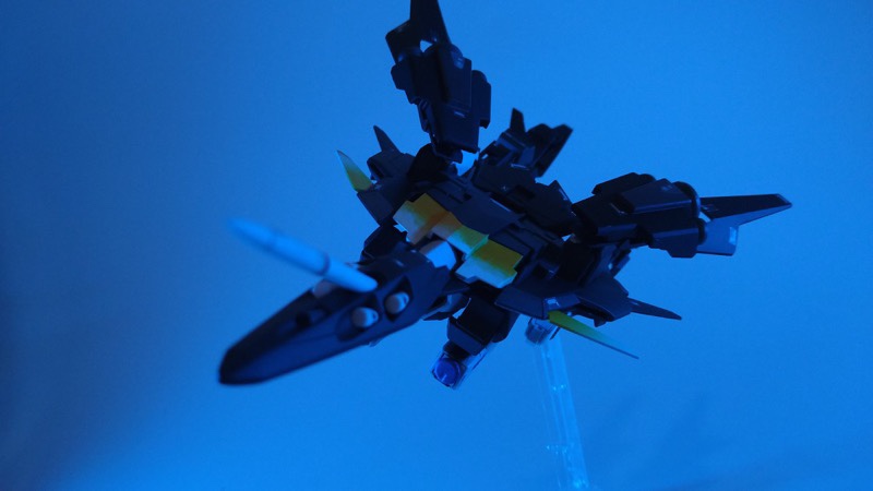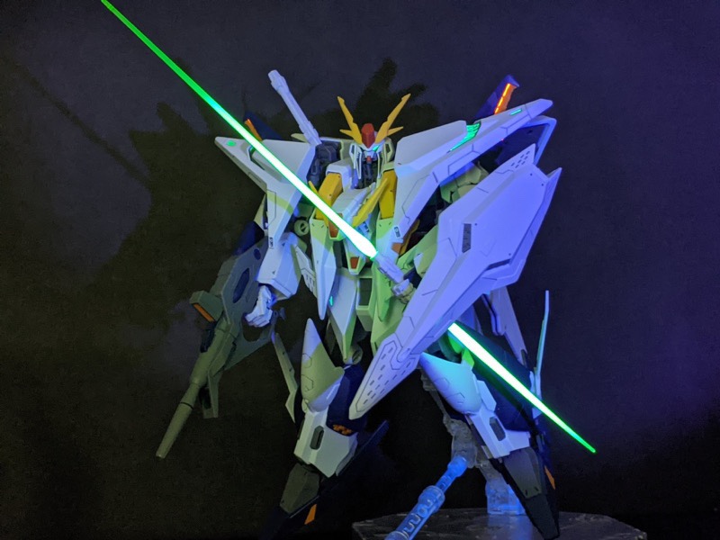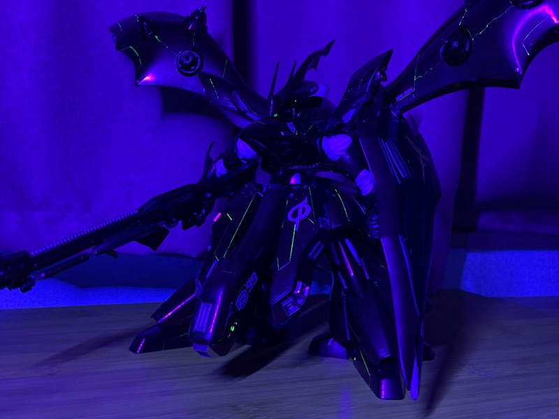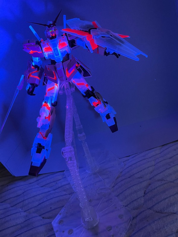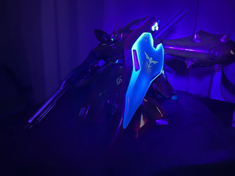 素組み&墨入れのみですが、付属のクリアパーツが蛍光素材だったので、部屋を暗くしてUVライトを当てて、夜景モードで撮影したら劇中のシーンぽく撮影できましたヨ。😉👍