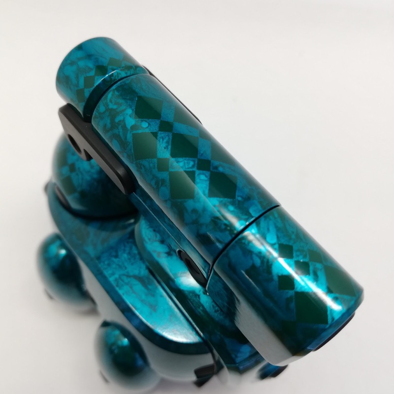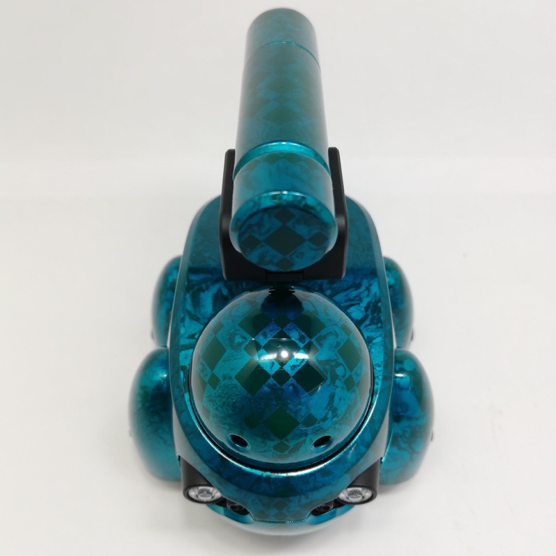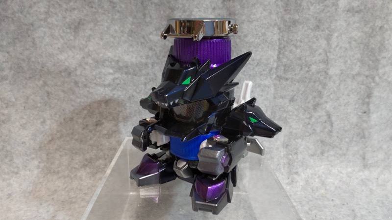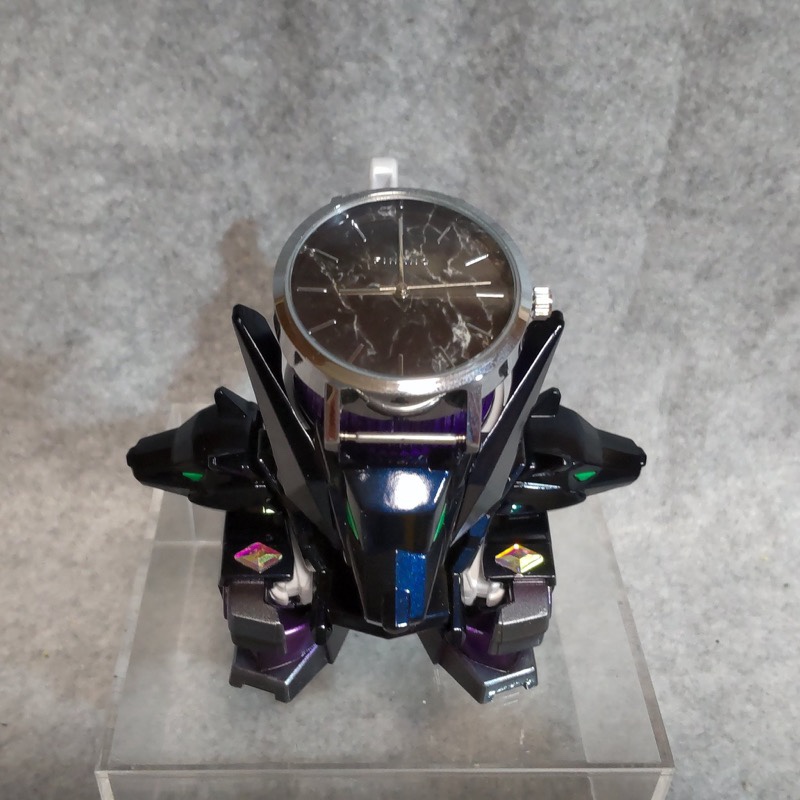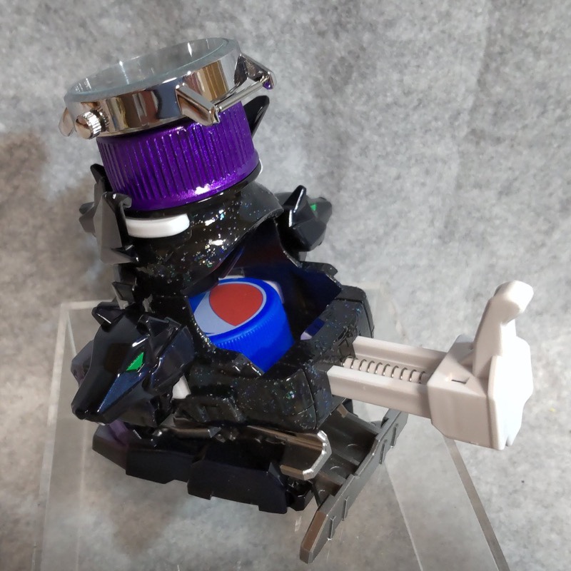 外装パーツは主にガイアノーツの偏光塗料とクレオスのメタルバイオレット。ボディはアクリラガッシュのラメ塗料を筆塗。ゴーグルはカーボン表現とし、上部の時計は本物です。#ボトルマン pic.twitter.com/TG9p8M9IOE