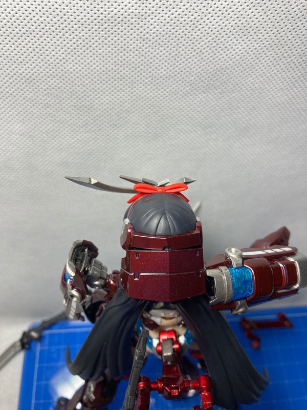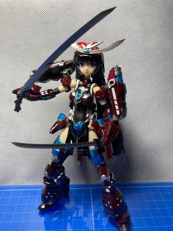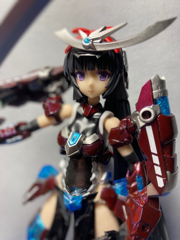 鎧全体は青竹色からクリアーレッドを吹いてあずき色にちかいキャンディ塗装をしました。他にもスジボリ、メタリックパーツ等でディティールを追加していき、鍬形(くわがた)の丸い青はクリアパーツを削ってはめ込みました。 pic.twitter.com/gye5HBwYA2