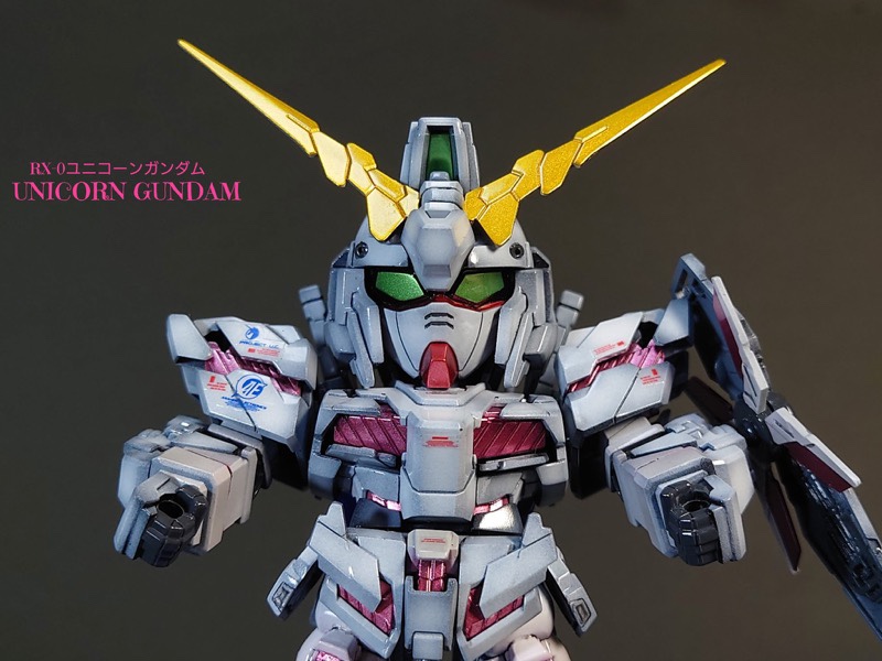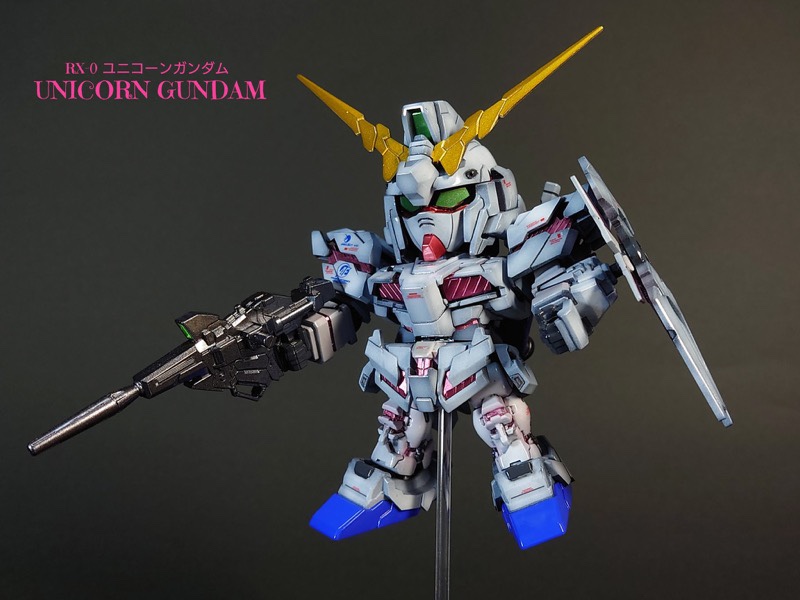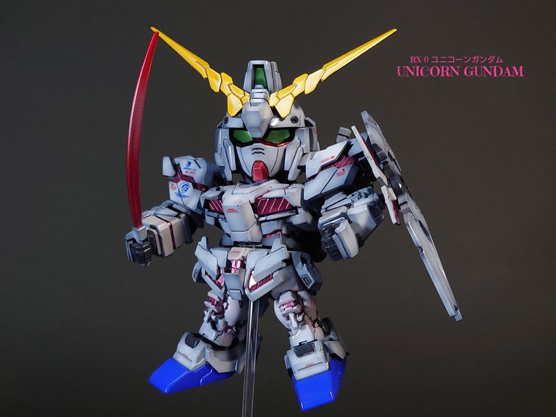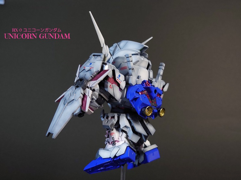 SDユニコーンガンダムです。BB戦士バージョンなのでポージングはあまり出来ませんが、グラデーションしっかり目に仕上げました。バーニアパワーアップして、光沢仕上げですがちょっとわかりにくいですね。#うみんちゅ杯2021秋 pic.twitter.com/rktIZg5ZTq