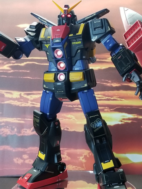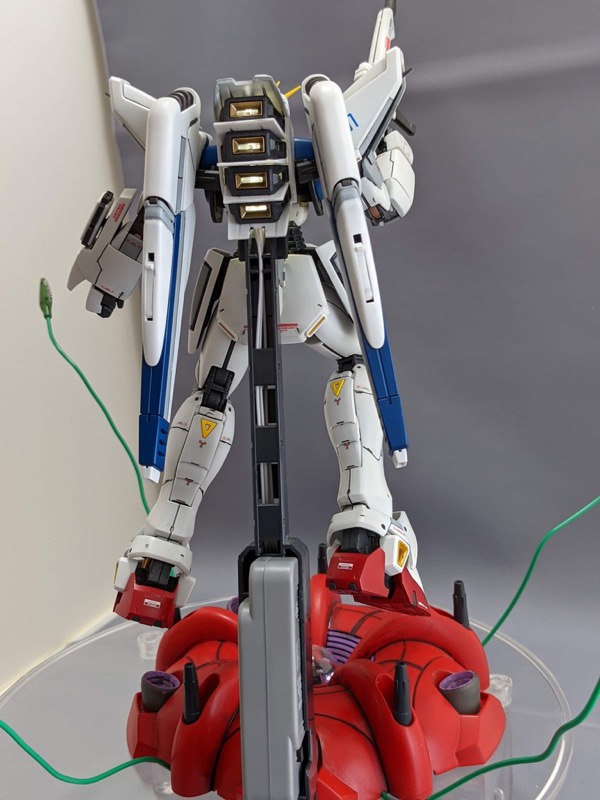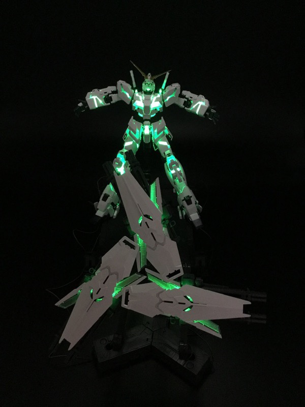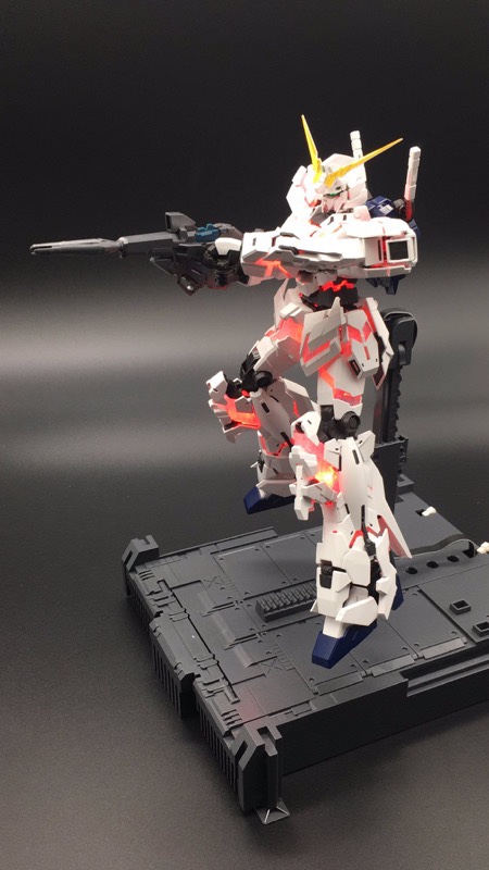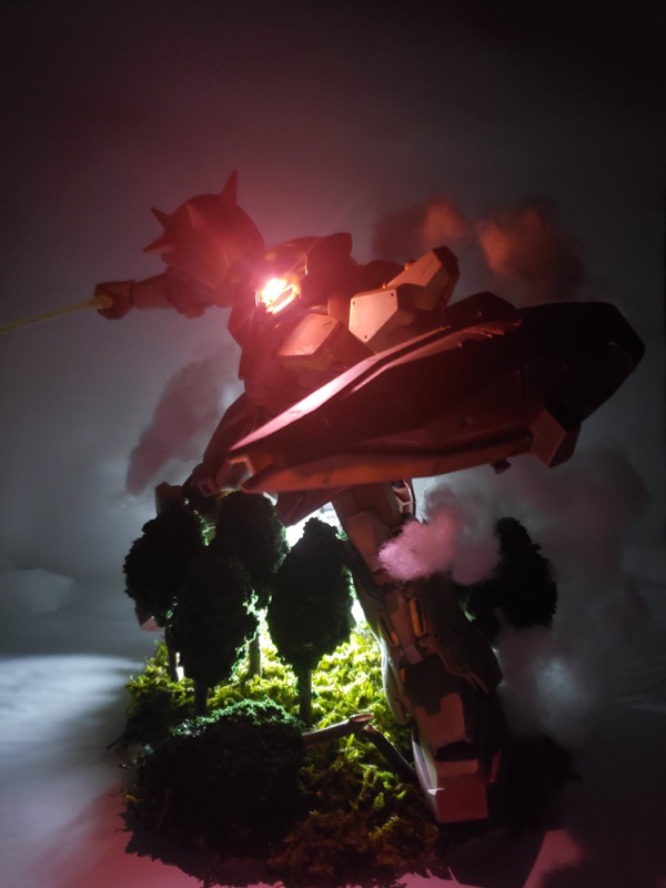 頭部後方よりLEDを搭載しモノアイの表現、ジオラマ下部に埋め込んだものでスラスター稼働時の表現をしてみました。