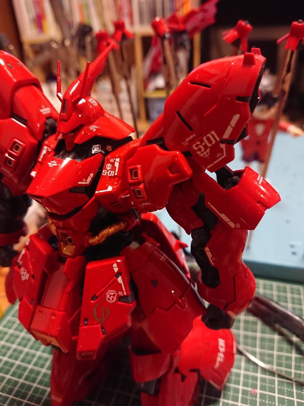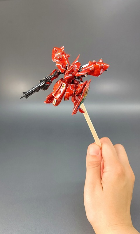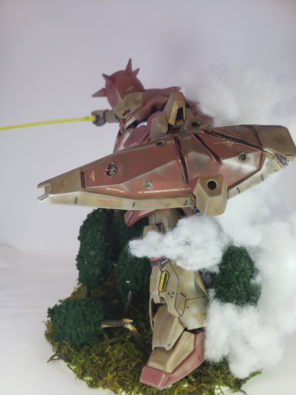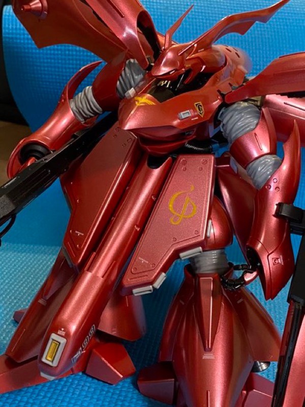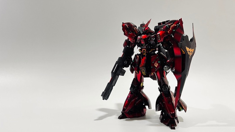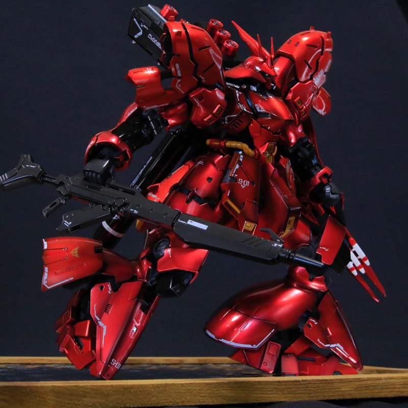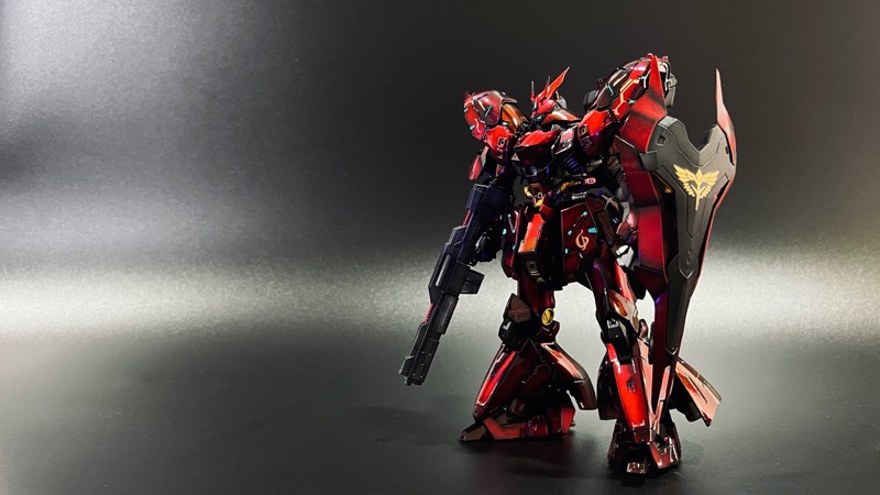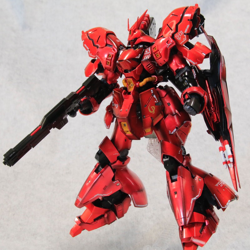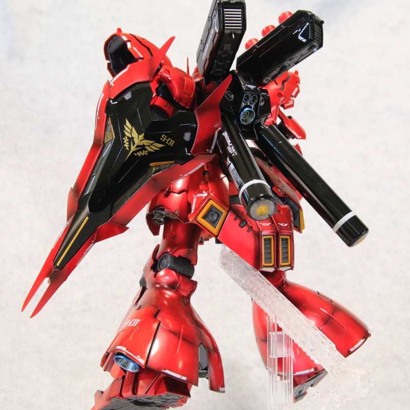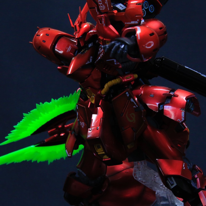RGサザビーをキャンディ塗装で仕上げました。写真ではわかりにくいですが、下地はゴールドとシルバー2色を使って、キャンディレッドの色味を変えています。クレオス新色のクリアルージュがいい仕事してくれました。