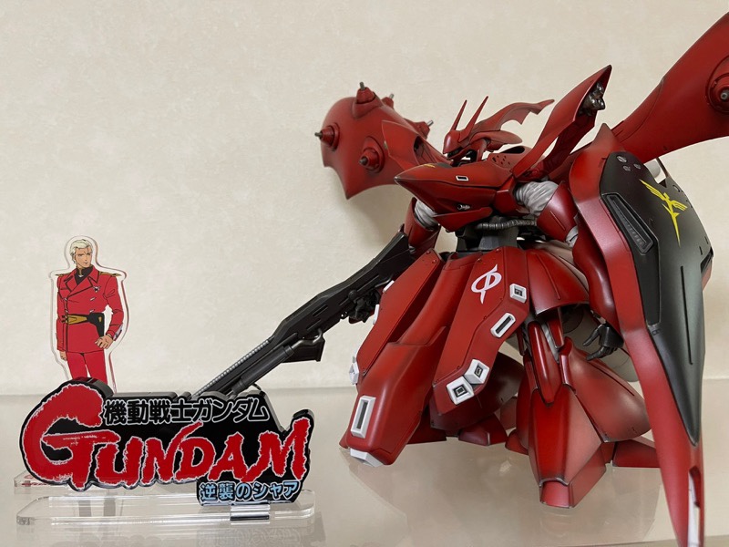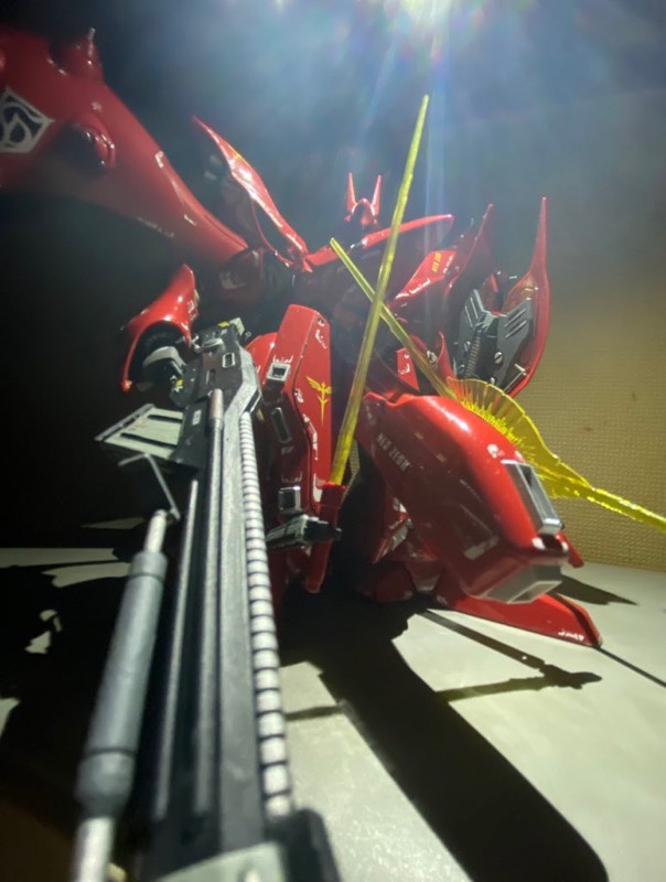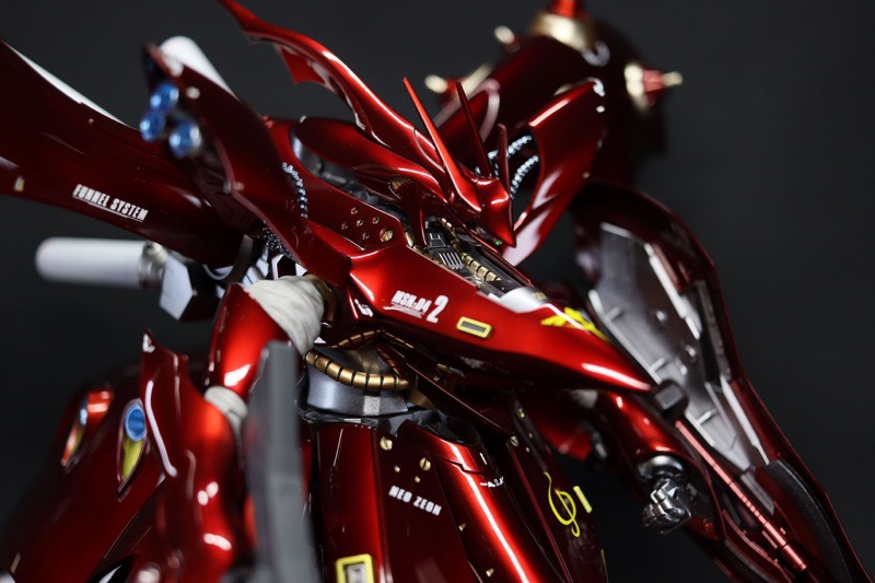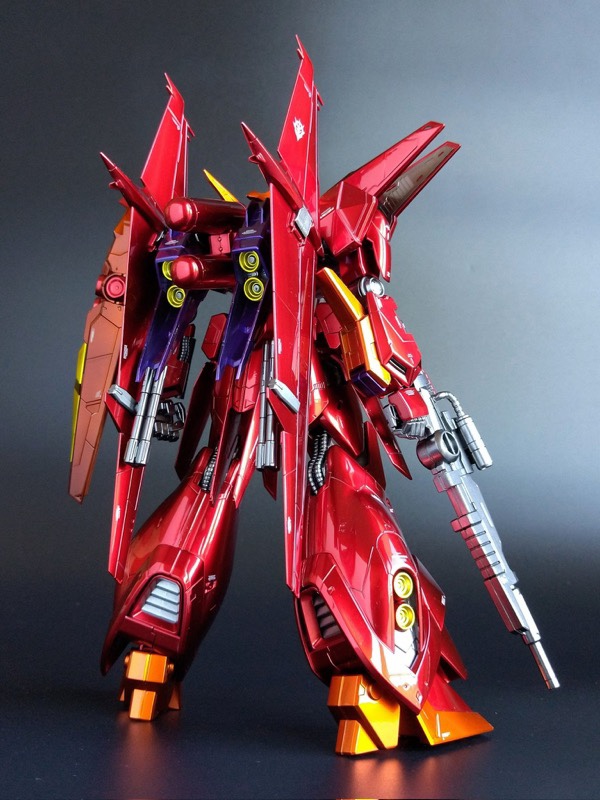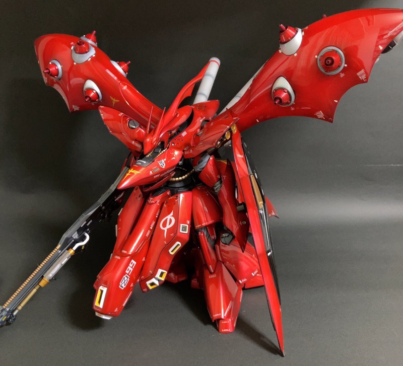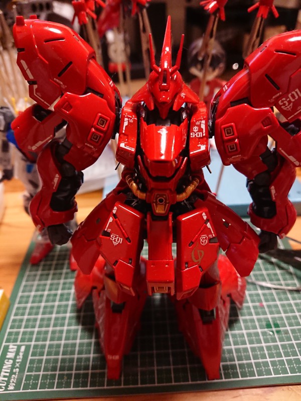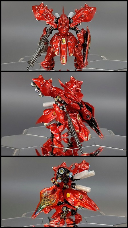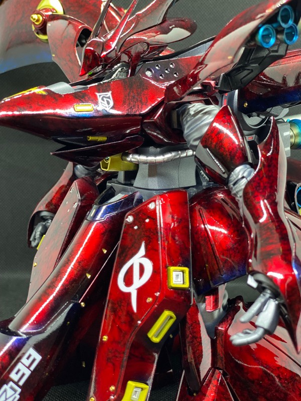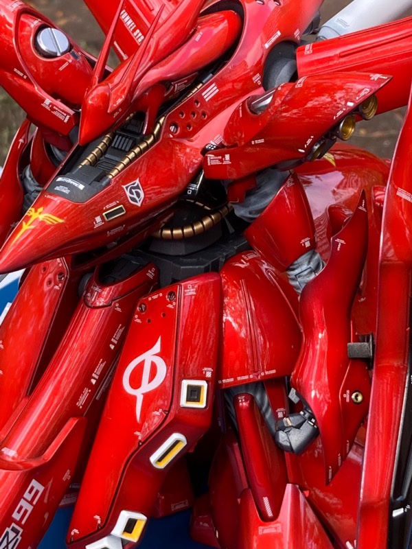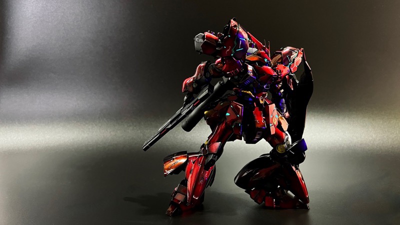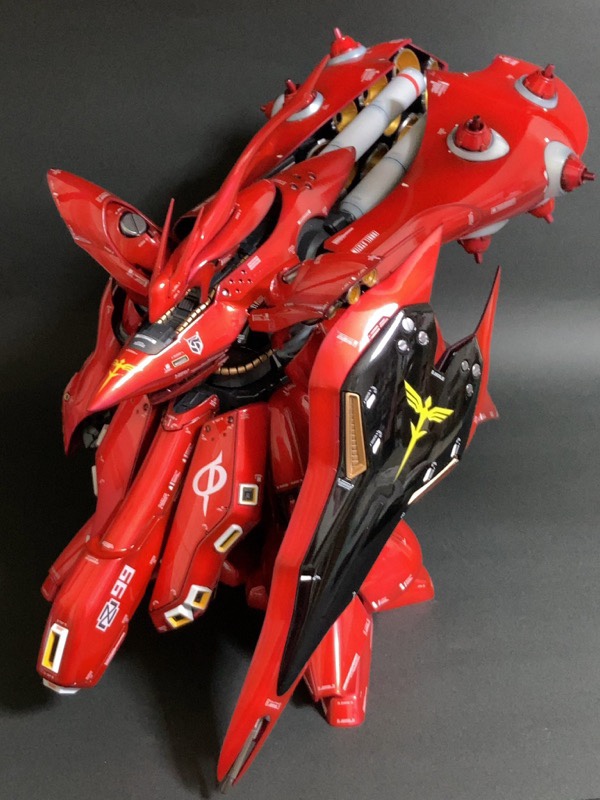 RGサザビーをキャンディ塗装で仕上げました。写真ではわかりにくいですが、下地はゴールドとシルバー2色を使って、キャンディレッドの色味を変えています。クレオス新色のクリアルージュがいい仕事してくれました。