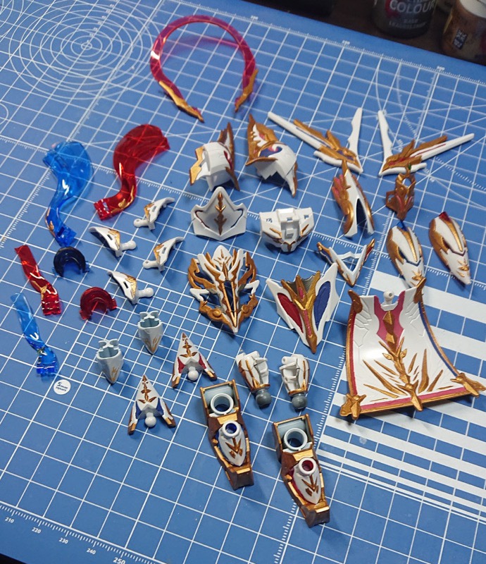 全身の金、赤、青部分等はシタデルカラーを使って根性で筆塗りしました。ここまで筆塗りに没頭したのは初めてです。仕上げにビスマスパールを吹いてフィニッシュしました。