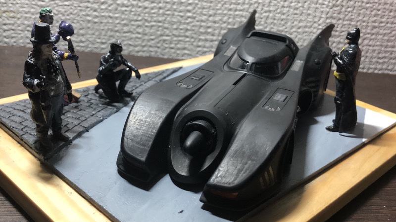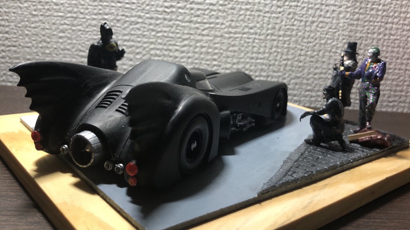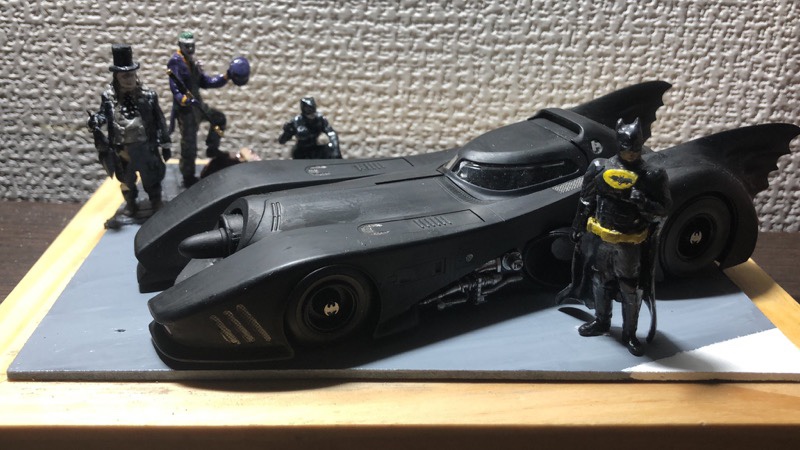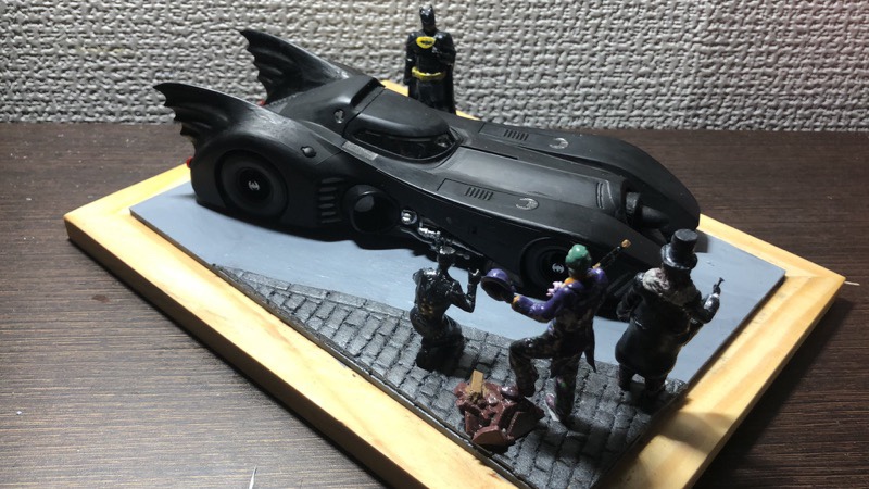 バットモービルとバットマン、ジョーカー、ペンギン、キャットウーマンのジオラマ