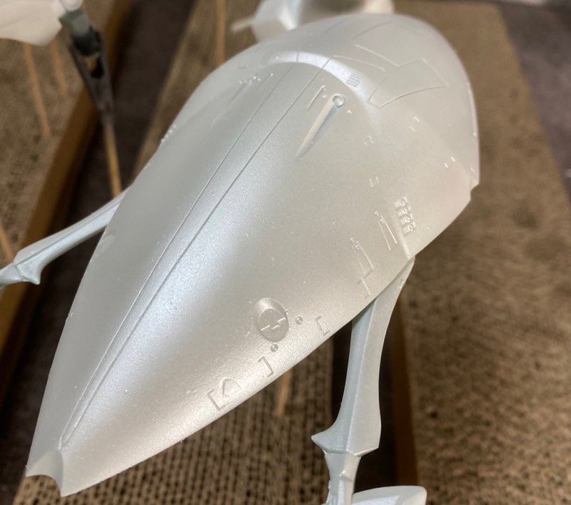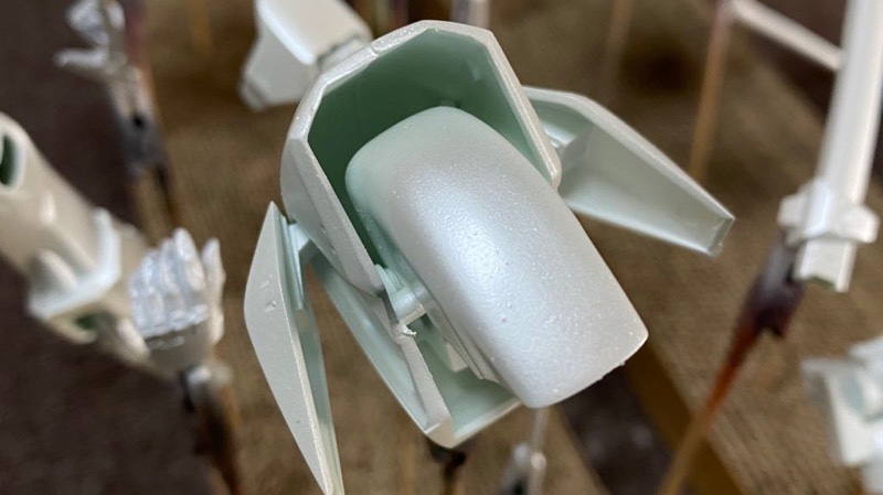 ホワイトサフを吹きます。グレーサフを吹かない理由はこのキットは最終的にホワイトパール仕上げをするためです。