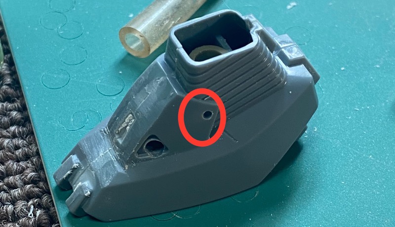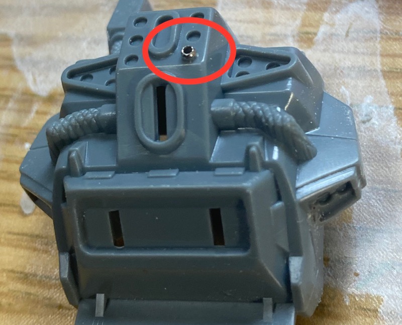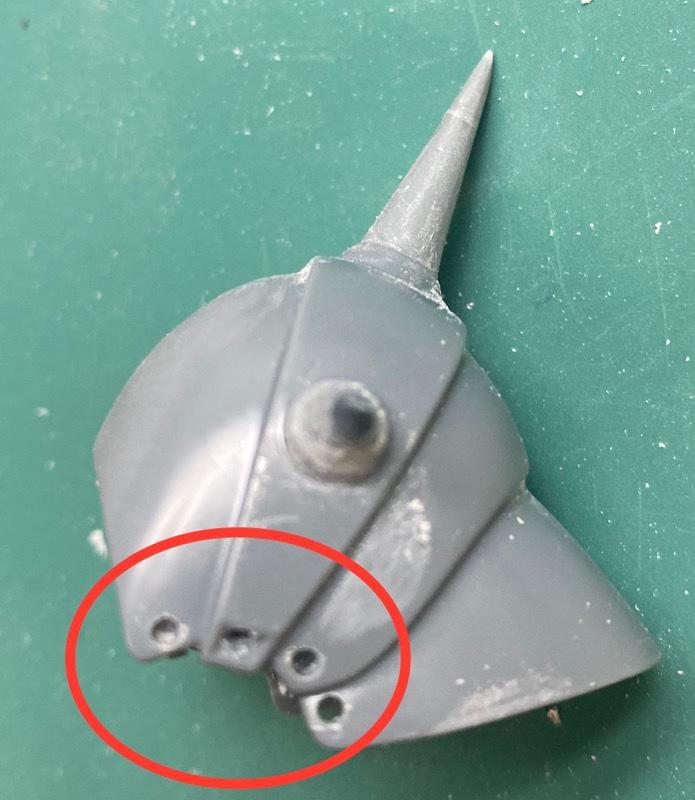 デナンゾンは「旧キット」ですので合わせ目けしが必須となりますが、最新キットの場合は合わせ目けしの工程がないと思いますので、その場合は塗装前に穴をあけてください。