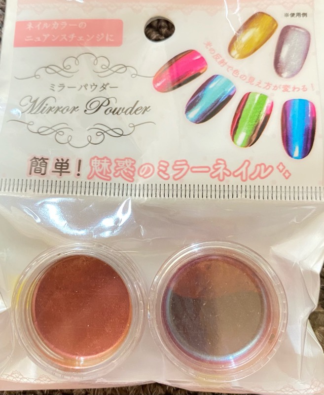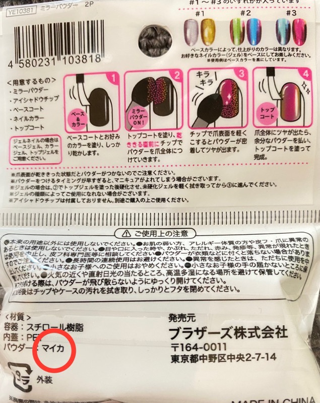 2枚目の丸の部分に「マイカ」と書いていますね。マイカは英語名で日本語名は雲母です。よくミラーネイルを「マジョーラーカラー」っぽいといわれる人がいますが、全然違うもので、マジョーラカラーは日本ペイント産の商標で一般的には「クロマフレア」という塗料になります。