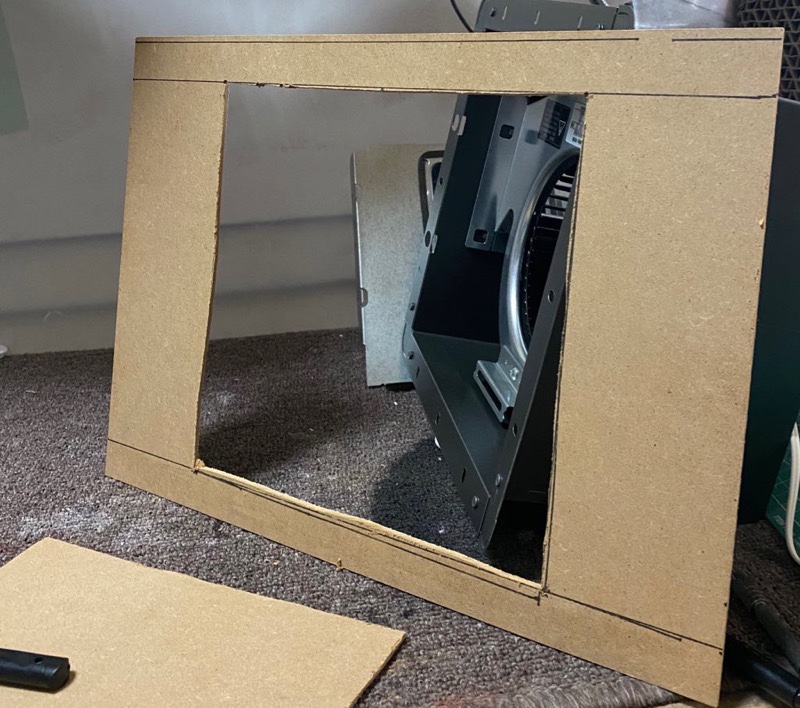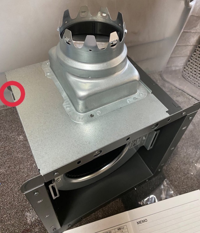 ・カットするときは大き目に穴をあけないと後からファンを通すことができません。ファンは先ほどのダクトホースを後付けするくらいの隙間が必要になります。もしくはダクトフォース接続部分をくっつけたまま後ろから通そうとするとものすごく大きい穴をあける必要があります。