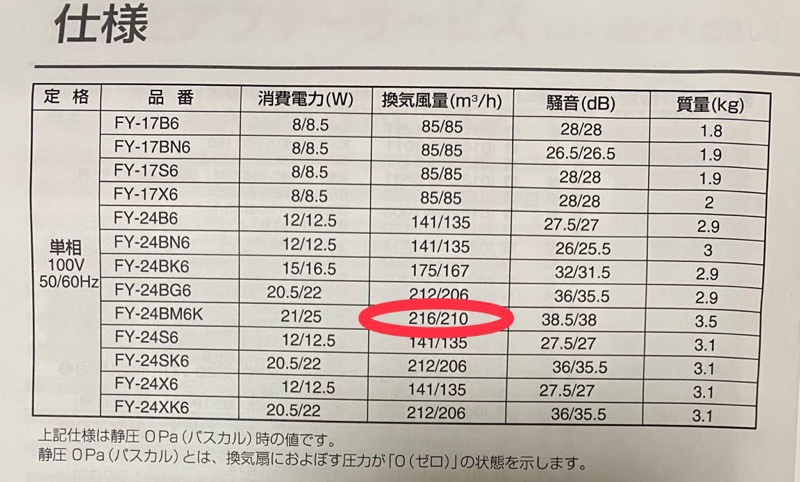 今回紹介した私のブースのファンは216㎥/hとなります。