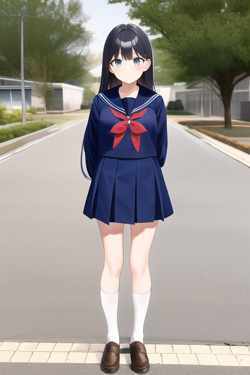 A high school girl in a sailor suit is standing in front of a school waiting for someone